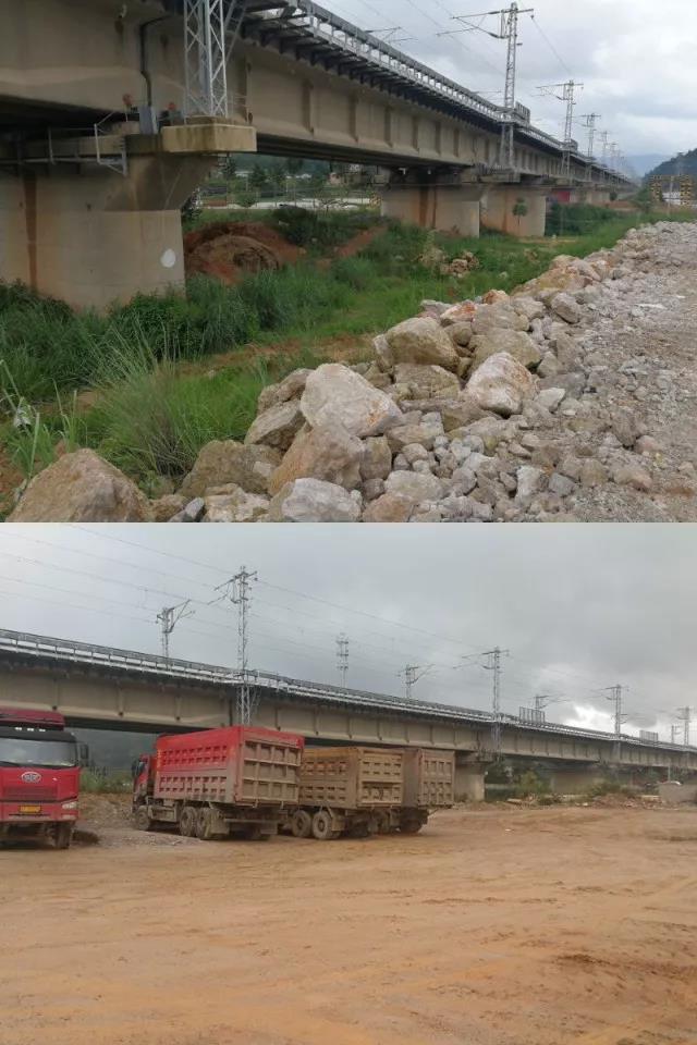 昆玉河线的运行,对完善铁路网,更好服务和融入国家一带一路”,面向南亚东南亚辐射中心建设,具有重要意义。目前每天有4 对动车组以及多趟普通旅客列车运行,下一步将开通高铁,昆玉河线涉及站点之一河口县,与越南老街市、谷柳市隔河相望,而位于柴河双线特大桥左侧的主营砂石料开采的某公司,将大量弃石、弃渣堆积成山,距离桥梁最近处仅5米,且将桥下紧挨约百米长防护围墙的一整片土地均用碎石渣铺垫,导致整个地面高度被人为抬升约2 米。而桥梁右侧为农田,土质松软,加之左侧大面积近距离堆放石渣,极易造成轨道变形、桥梁歪斜等,安全隐患风险极高。